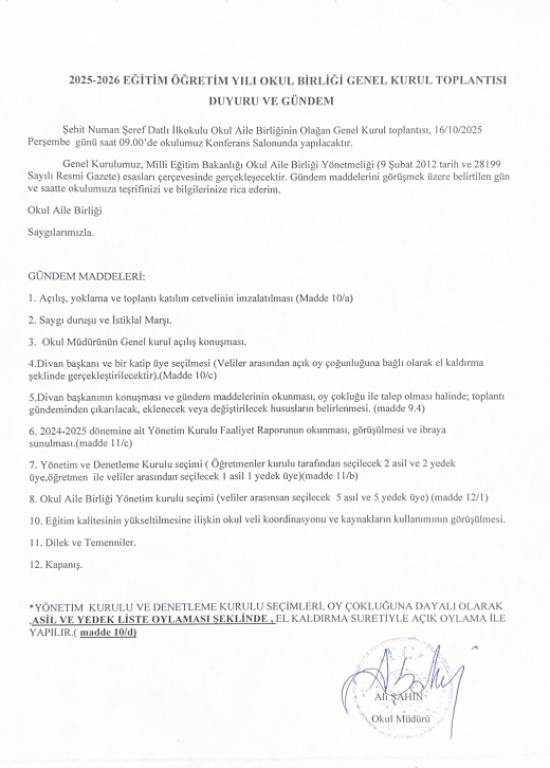 Okulumuz 2025-2026 Eğitim Öğretim Yılı Okul Aile Birliği Seçimleri 16/10/2025 tarihinde saat 09.00'de okulumuz konferans salonunda gerçekleştirilecektir.